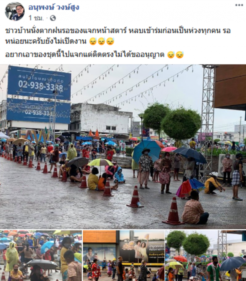 เรียกได้ว่าเป็นอีกหนึ่งเรื่องราว ที่ถูกพูดถึงอย่างมากในโลกออนไลน์ วันที่ 27 เมษายน ผู้ใช้เฟซบุ๊กชื่อ อนุพงษ์ วงษ์สูง ได้มีการโพสต์ภาพของประชาชนจำนวนมากเข้าแถวตากฝน เพื่อต่อคิวรอรับของแจกจากผู้ใจบุญ โดยผู้โพสต์ระบุข้อความว่า ชาวบ้านนั่งตากฝนรอของแจกหน้าสตาร์ รอหน่อยนะครับ ยังไม่เปิดงาน อยากเอาของชุดนี้ไปแจกแต่ติดตรงไม่ได้ขออนุญาต