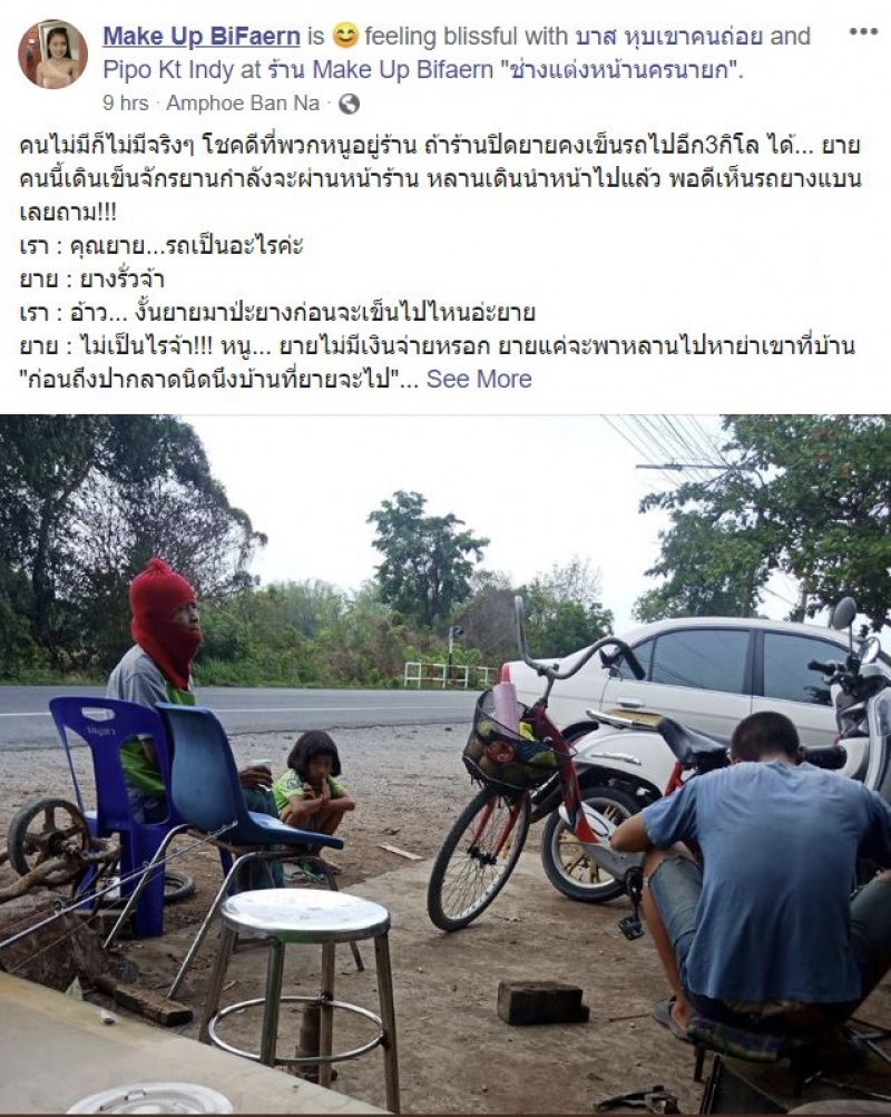 ป้า คนนี้เดินเข็นจักรยานกำลังจะผ่านหน้าร้าน หลานเดินนำหน้าไปแล้ว พอดีเห็นรถยางแบนเลยถาม