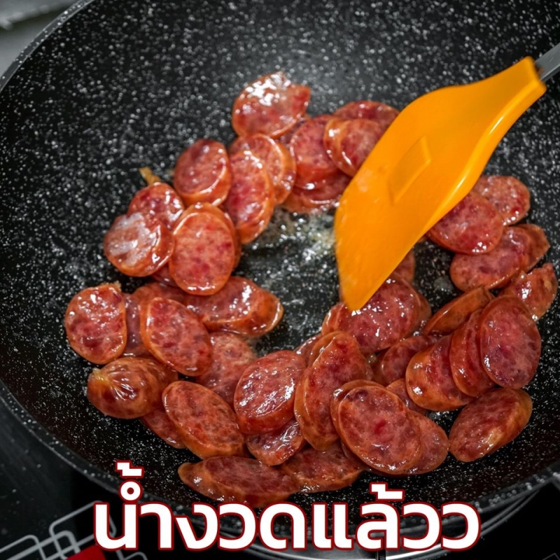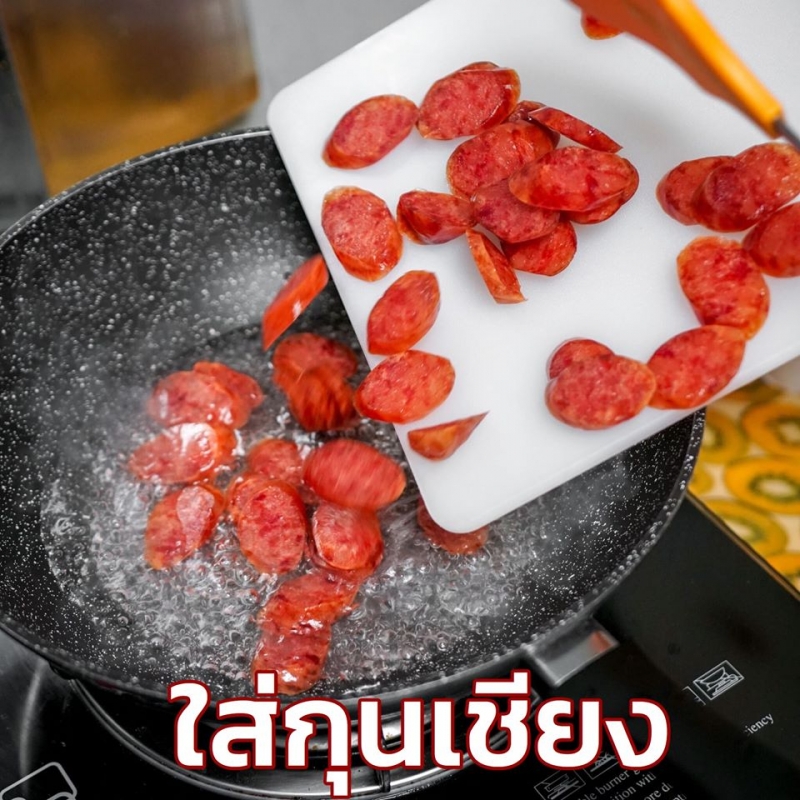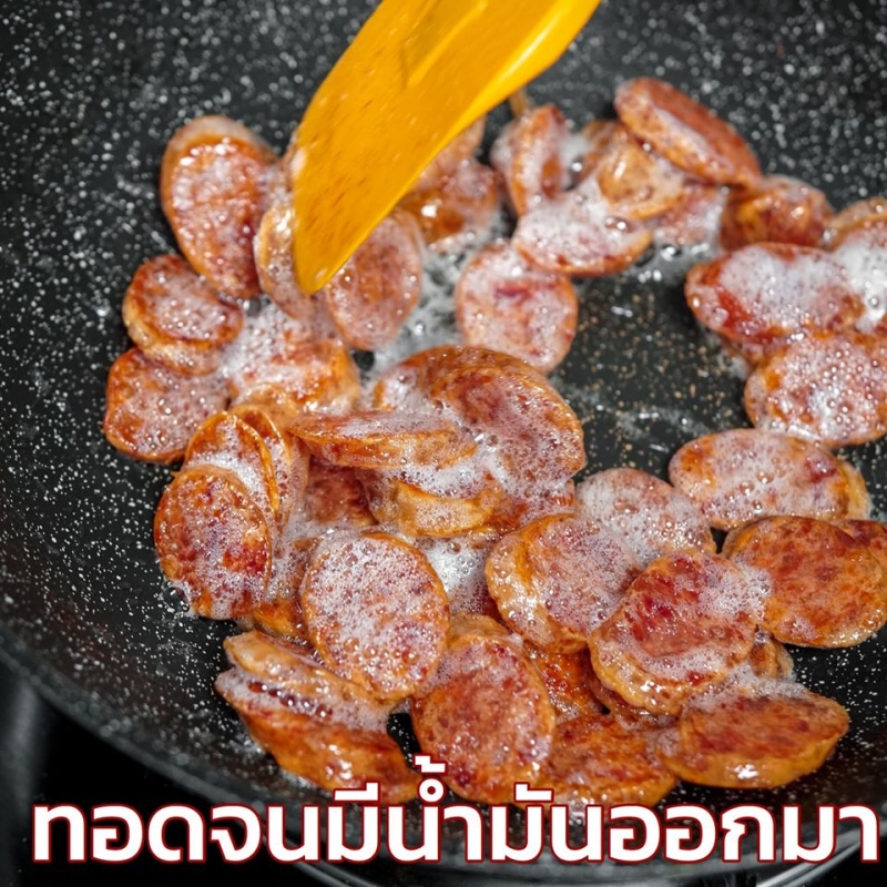 เตรียมกุนเชียงที่จะทอด ตั้งกะทะใส่น้ำให้ร้อน ใส่กุนเชียงที่เตรียมไว้ ทอดไปจนน้ำแห้ง และ และจะมีน้ำมันออกมาจากกุนเชียง