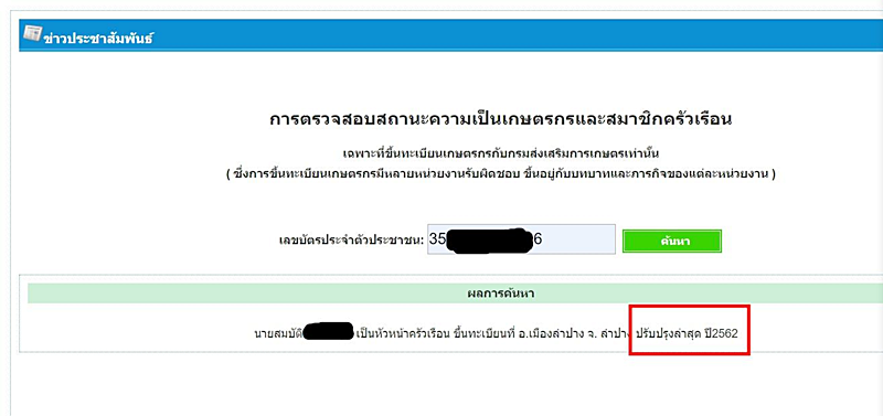 หากข้อมูลขึ้นว่า ปรับปรุงล่าสุด ปี 2562 หรือ 2563 แสดงว่าท่านจัดอยู่ในกลุ่มที่ 1 เกษตรกรรายเก่า : ทำเกษตรเป็นประจำ มีชื่ออยู่แล้ว