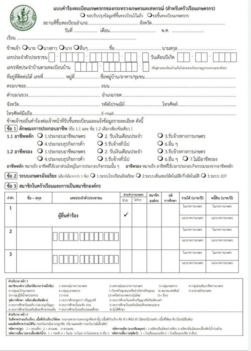 เกษตรกรกลุ่มนี้ คือเกษตรกรที่ไม่เคยมาปรับปรุงข้อมูลเลย หากปัจจุบันท่านยังเป็นเกษตรกรอยู่ ให้ดาวน์โหลด แบบคำร้อง ทบก 01 ดาวน์โหลดได้จาก ที่นี่ กรอกรายละเอียดให้ครบถ้วน ให้ผู้นำชุมชน ผู้ใหญ่บ้าน ลงชื่อรับรองมาให้ครบถ้วน แล้วค่อยเอาไปขอปรับปรุงข้อมูลการเพาะปลูกให้เป็นปัจจุบัน
