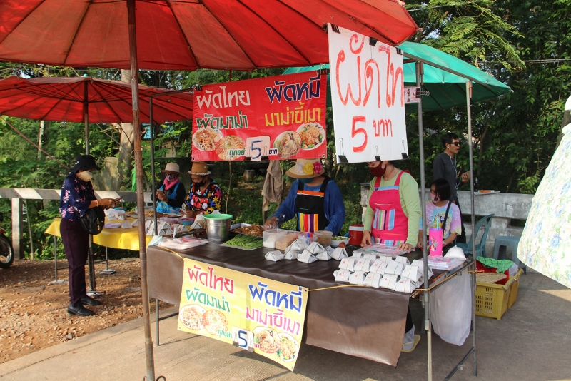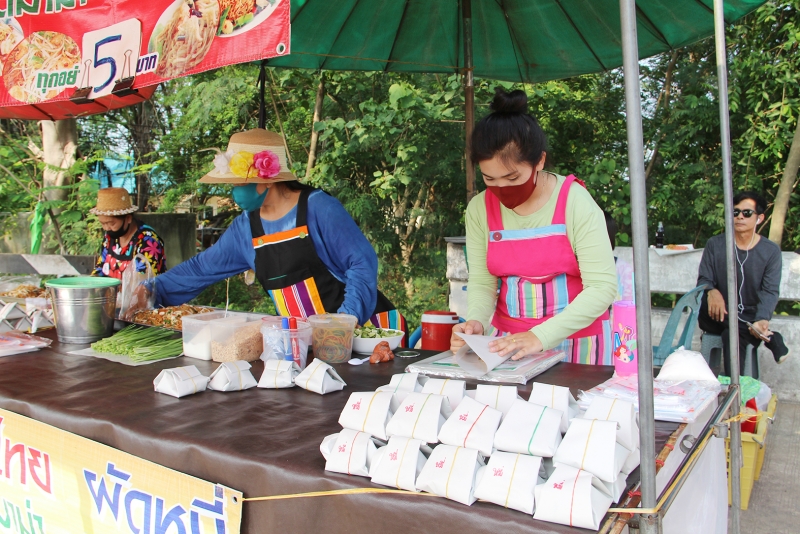 สำหรับเส้นก๋วยเตี๋ยวผัดไทยก็จะมีหลากหลายเส้น เช่น ผัดไทยเส้นเล็กที่ลุงสมหวังคนผัด บอกว่าจะใช้ประมาณวันละ 70 กิโลกรัม ส่วนเส้นอื่น ๆ ก็มากบ้าง น้อยบ้าง ไม่เท่ากัน เช่น ผัดไทยวุ้นเส้น ผัดไทยเส้นหมี่ ส่วนเครื่องปรุงสำหรับผัดไทยนั้นก็จะใช้น้ำมะขามเปียก น้ำตาล มีถั่วคั่ว มะนาว ถั่วงอก กะหล่ำปลี และเครื่องเคียงอีกหลายอย่างตามสูตร ผัดใส่กระทะตักออกมาใส่ภาชนะแล้วให้ลูกหลาน ช่วยกันบรรจุห่อ มีลูกค้าทั้งในหมู่บ้านชุมชนที่เป็นขาประจำ และลูกค้าจากพื้นที่ต่าง ๆ จะแวะเวียนมาซื้อ หน้าร้านมาป้ายเขียนบอกราคา ข้อความว่า ผัดไทย ผัดวุ้นเส้น ผัดหมี่ มาม่า ทุกอย่าง 5 บาท ซึ่งชวนให้น่าลิ้มลองกับยุคเศรษฐกิจที่ต้องอยู่กันแบบรัดเข็มขัดกันในช่วงนี้