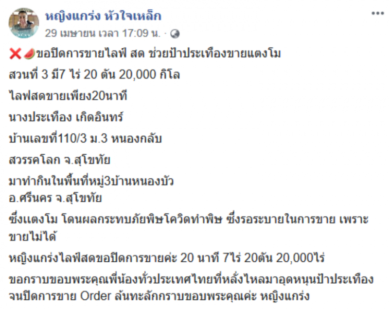 จากกรณี ผู้ใช้เฟซบุ๊กชื่อ หญิงแกร่ง หัวใจเหล็ก ได้มีโพสต์ เพื่อช่วยขายแตงโมที่สวนของ ลุงจันทร์ ที่ ตำบลหนองบัว อำเภอศรีนคร จังหวัดสุโขทัย ซึ่งลุงจันทร์ปลูกแตงโมไว้ 29 ไร่ พอกำลังจะเก็บปรากฏว่าเกิดฝนตกอย่างหนัก จนหน้าดินแฉะ ไม่สามารถเดินเข้าไปได้ ส่วนที่เก็บได้ก็รวมกองไว้บ้าง มีส่วนที่ได้รับผลกระทบจากน้ำขัง