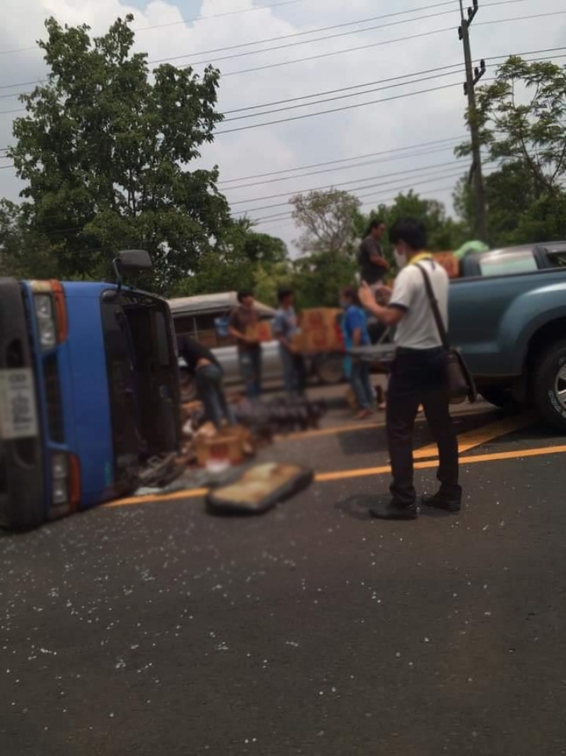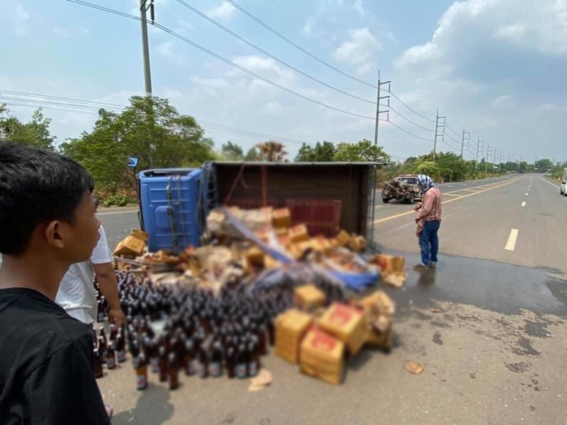 สะเทือนใจสายจ๊วด เกิดเหตุรถบรรทุกเหล้า พลิกคว่ำ