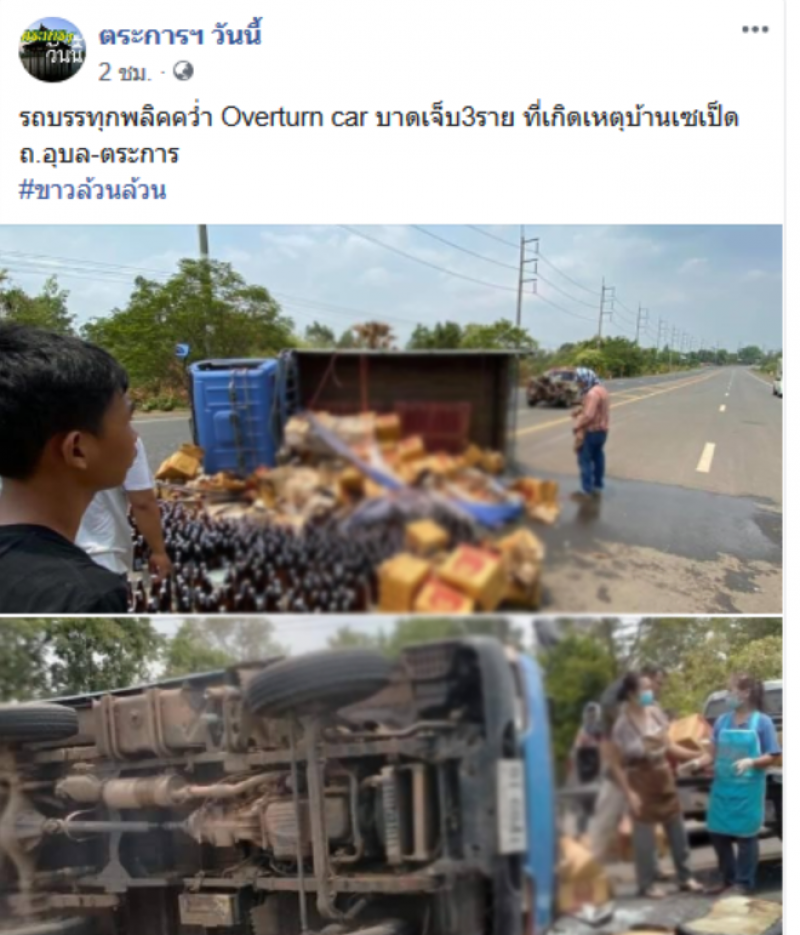 ล่าสุดในโลกออนไลน์ได้มีการลงภาพ เกิดเหตุรถบรรทุกสุราพลิกคว่ำ ที่ ถ.อุบล-ตระการ จังหวัดอุบลราชธานี สร้างความตกใจในโลกออนไลน์เป็นอย่างมาก โดยหลังจากที่ได้มีการโพสต์ภาพ ก็มีชาวโซเชียล แห่เข้าไปแสดงความคิดเสียดายกัน แถมวันนี้ยังเป็นวันแรกที่เริ่มอนุญาตให้จำหน่ายสุราได้อีกด้วย