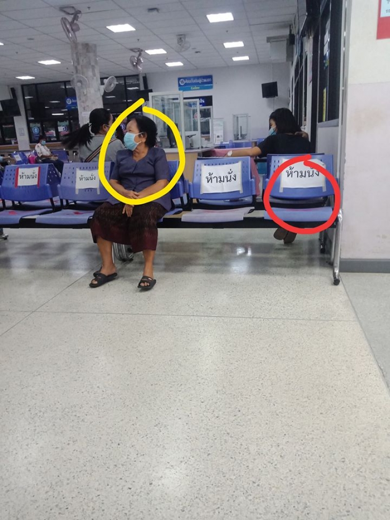 คุณยายในภาพก็ทำถูกต้องแล้วนี่ครับ รพ เขาจะมาร์คตำแหน่งเก้าอี้ที่ห้ามนั่ง แล้วให้นั่งตรงจุดที่ไม่มีป้าย เพื่อให้เว้นระยะห่างจากคนอื่นเป็น social distancing ยายแกน่าชื่นชมนะ