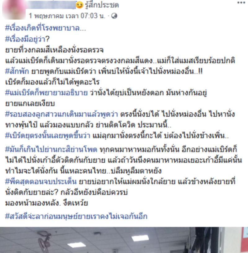 เป็นอีกหนึ่งเรื่องราวที่ถูกวิพากษ์วิจารณ์เป็นอย่างมาก ในโลกออนไลน์ได้มีผู้ใช้เฟซบุ๊กรายหนึ่ง ซึ่งเป็นหนุ่มหมอลำวงชื่อดัง โพสต์ภาพคุณยายที่นั่งเก้าอี้โรงพยาบาล พร้อมกับเล่าเหตุการณ์ระบุว่า