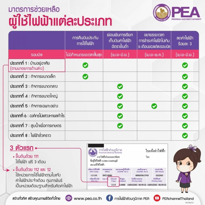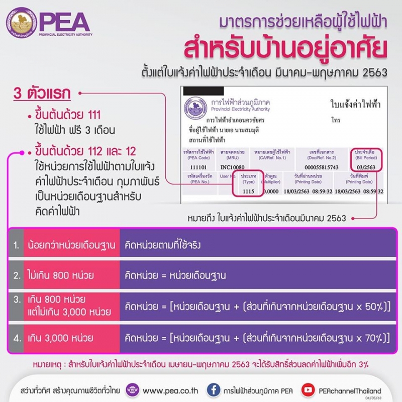 เเละล่าสุดนั้นในวันที่ 5 พ.ค.63 ทาง การไฟฟ้าส่วนภูมิภาค PEA ได้เคาะอีกหนึ่งมาตรการช่วยเหลือ สำหรับบ้านอยู่อาศัย ตั้งแต่ใบแจ้งค่าไฟฟ้าประจำเดือน มี.ค. พ.ค. 63 สำหรับรหัสประเภทผู้ใช้ไฟฟ้า Type ที่เลข 3 ตัวหน้าขึ้นต้นด้วย 111 ได้ใช้ไฟฟรี 3 เดือน