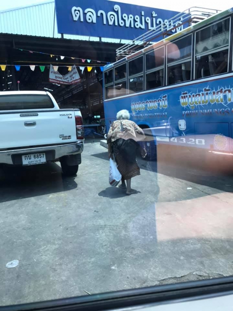 สาวเจอคุณยาย เดินเท้าเปล่าคนเดียว