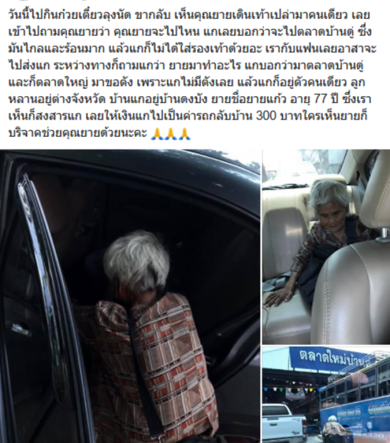 วันที่ 9 พฤษภาคม ได้มีผู้ใช้เฟซบุ๊กชื่อ ภารดี ราชวงค์ โพสต์เรื่องราว หลังจากที่เจอคุฯายาท่านหนึ่ง โดยระบุว่า วันนี้ไปกินก๋วยเตี๋ยวลุงนัด ขากลับ เห็นคุณยายเดินเท้าเปล่ามาคนเดียว เลยเข้าไปถามคุณยายว่า คุณยายจะไปไหน แกเลยบอกว่าจะไปตลาดบ้านดู่ ซึ่งมันไกลและร้อนมาก แล้วแกก็ไม่ได้ใส่รองเท้าด้วยอะ เรากับแฟนเลยอาสาจะไปส่งแก ระหว่างทางก็ถามแกว่า ยายมาทำอะไร แกบอกว่ามาตลาดบ้านดู่ และก็ตลาดใหญ่ มาขอตัง เพราะแกไม่มีตังเลย แล้วแกก็อยู่ตัวคนเดียว ลูกหลานอยู่ต่างจังหวัด บ้านแกอยู่บ้านดงบัง ยายชื่อยายแก้ว อายุ 77 ปี ซึ่งเราเห็นก็สงสารแก เลยให้เงินแกไปเป็นค่ารถกลับบ้าน 300 บาทใครเห็นยายก็บริจาคช่วยคุณยายด้วยนะคะ