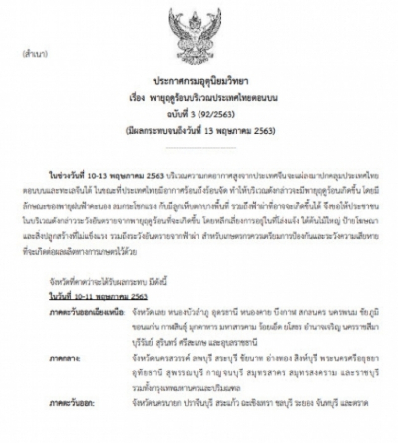 วันที่ 9 พ.ค.63 มีรายงานว่า กรมอุตุฯ ออกประกาศระบุว่า พายุฤดูร้อนบริเวณประเทศไทยตอนบน มีผลกระทบจนถึงวันที่ 13 พฤษภาคม 2563 ฉบับที่ 3 ลงวันที่ 9 พ.ค.63ในช่วงวันที่ 10-13 พ.ค.63 บริเวณความกดอากาศสูงจากประเทศจีนจะแผ่ลงมาปกคลุมประเทศไทยตอนบนและทะเลจีนใต้ ในขณะที่ประเทศไทยมีอากาศร้อนถึงร้อนจัด