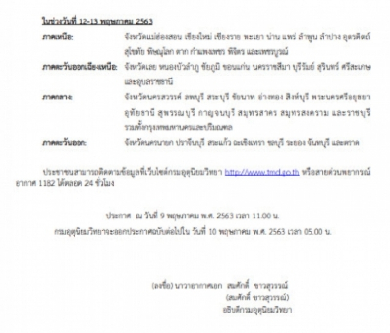 ภาคตะวันออก: จังหวัดนครนายก ปราจีนบุรี สระแก้ว ฉะเชิงเทรา ชลบุรี ระยอง จันทบุรี และตราด ประชาชนสามารถติดตามข้อมูลที่เว็บไซต์กรมอุตุฯ http://www.tmd.go.th หรือสายด่วนพยากรณ์อากาศ 1182 ได้ตลอด 24 ชั่วโมง ประกาศ ณ วันที่ 9 พฤษภาคม พ.ศ. 63 เวลา 11.00 น.กรมอุตุฯจะออกประกาศฉบับต่อไปใน วันที่ 10 พ.ค.63 เวลา 05.00 น.