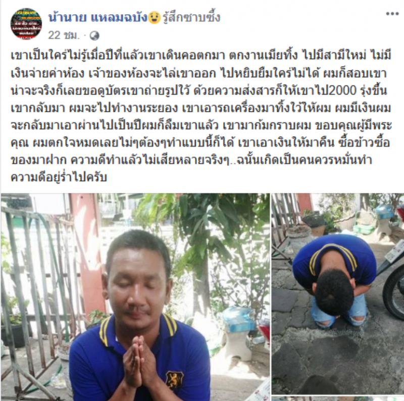 เมื่อวันที่ 10 พฤษภาคมที่ผ่านมา ผู้ใช้เฟซบุ๊กชื่อ น้านาย แหลมฉบัง ได้มีการโพสต์เรื่องราว หลังจากที่เขาได้เจอกับหนุ่มรายหนึ่ง ที่เข้ามาก้มกราบ โดยระบุว่า เขาเป็นใคร่ไม่รู้เมื่อปีที่แลัวเขาเดินคอตกมา ตกงานเมีย ทิ้ง ไปมีสามีใหม่ ไม่มีเงินจ่ายค่าห้อง เจ้าของห้องจะ ไล่ เขาออก ไปหยิบยืมใครไม่ได้ ผมก็สอบเขาน่าจะจริงก็เลยขอดูบัตรเขาถ่ายรูปใวั