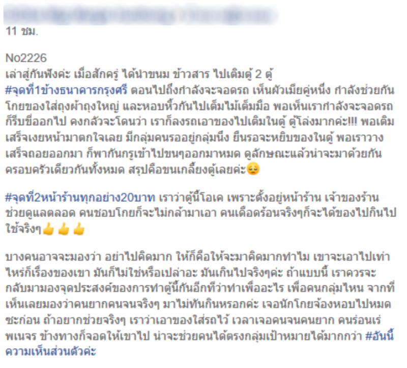 บางคนอาจจะมองว่า อย่าไปคิดมาก ให้ก็คือให้จะมาคิดมากทำไม เขาจะเอาไปเท่าไหร่ก็เรื่องของเขา มันก็ไม่ใช่หรือเปล่าอะ มันเกินไปจริงๆค่ะ ถ้าแบบนี้ เราควรจะกลับมามองจุดประสงค์ของการทำตู้นี้กันอีกทีว่าทำเพื่ออะไร เพื่อคนกลุ่มไหน จากที่เห็นเลยมองว่าคนคนจนจริงๆ มาไม่ทันกินหรอกค่ะ เจอนักโกยจ้องหอบไปหมดซะก่อน ถ้าอยากช่วยจริงๆ เราว่าเอาของใส่รถไว้ เวลาเจอคนจนคนยาก คนร่อนเร่พเนจร ข้างทางก็จอดให้เขาไป น่าจะช่วยคนได้ตรงกลุ่มเป้าหมายได้มากกว่า อันนี้ความเห็นส่วนตัวค่ะ