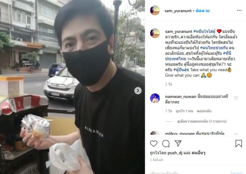 โดยคุณพ่อแซม ได้โพสต์คลิปในไอจี พร้อมระบุว่า หยิบ ใจ ใส่ ตู้ แบ่งปันความรัก ความ อิ่ม ให้กัน ใครอิ่มแล้วพอที่จะแบ่งปันได้ก็ช่วยกัน ใครขัดสนไม่เพียงพอก็มาแบ่งไป คนไทยช่วยกัน คนละเล็ก น้อย สุขใจทั้งผู้ให้และผู้รับ ที่นี่ประเทศไทย วันนี้เอามาเติมหลายเที่ยวหน่อยครับ ตู้นี้อยู่ตรงซอยสุขุมวิท71 นะครับ ตู้ปันสุข Take what you need Give what you can
