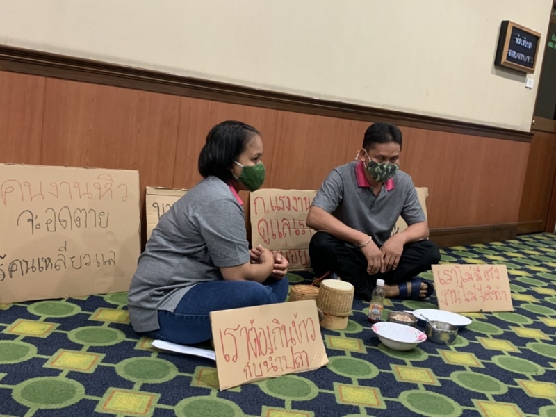 โดยนายจ้างอ้างผลกระทบจากโควิด 19 จึงไม่ยอมจ่ายเงินค่าจ้าง อีกทั้งบริษัทหักเงินเดือนแต่กลับไม่นำส่งเงินประกันสังคมให้ลูกจ้าง ทำให้ลูกจ้างเสียสิทธิช่วยเหลือรักษาพยาบาล ทั้งนี้ได้มีการนำปิ่นโตใส่ข้าวเปล่าคลุกน้ำปลา มานั่งกินที่กระทรวงฯ เพื่อสื่อให้เห็นว่า กำลังจะอดตายด้วย