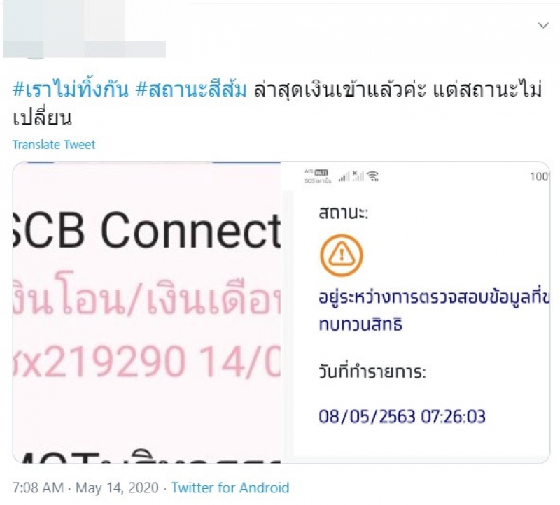 ล่าสุด 14 พฤษภาคม 2563 จากการตรวจสอบบนโลกออนไลน์ พบว่าในวันนี้ หลายคนบอกว่าเงินได้โอนเข้าแล้ว แม้ว่าสถานะจะยังค้างอยู่ที่สีเหลือง คือการรอตรวจสอบอยู่ และบางคนก็สถานะเปลี่ยนเป็นสีเขียว แม้ว่าเงินจะยังไม่เข้า โดยกลุ่มที่โอนเงินเข้านี้ หลายคนเป็นคนที่เคยทบทวนสิทธิ และหากเปลี่ยนเป็นสถานะสีเขียวแล้ว อีกไม่นานก็จะได้รับเงิน