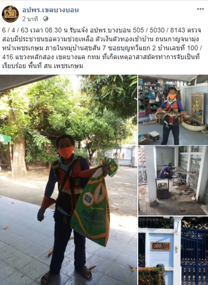 รับแจ้ง อปพร.บางบอน 505 / 5030 / 8143 ตรวจสอบมีประชาชนขอความช่วยเหลือ ตัวเงินตัวทองเข้าบ้าน