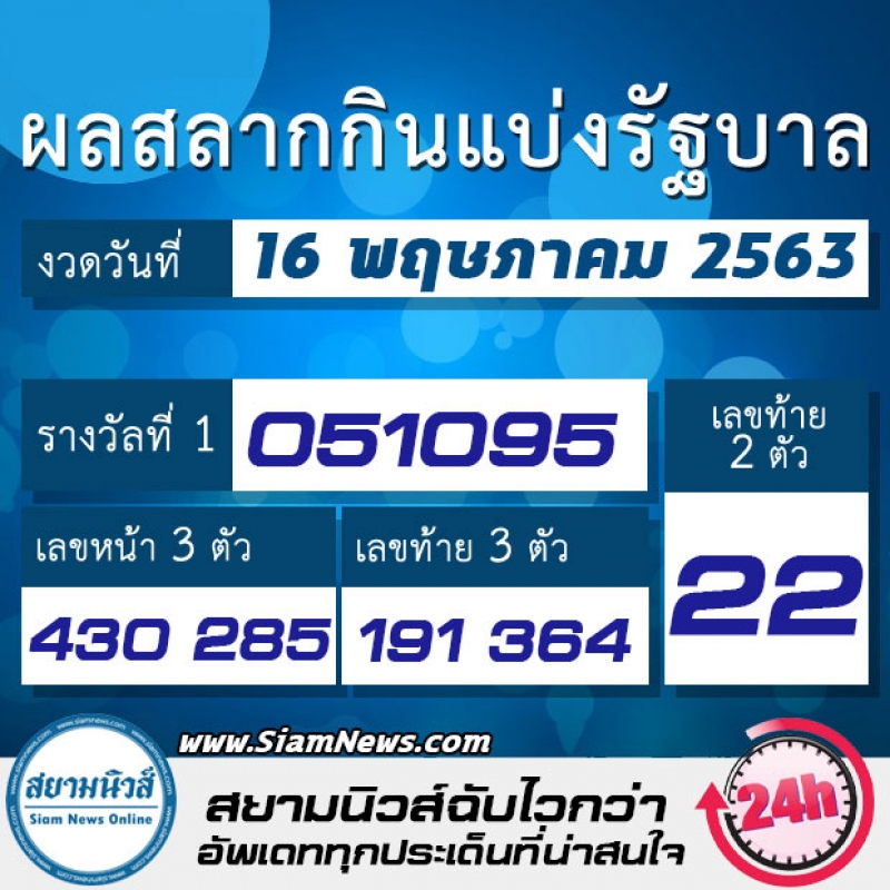 ผลการออกรางวัลสลากกินแบ่งรัฐบาล วันที่ 16 พฤษภาคม 2563