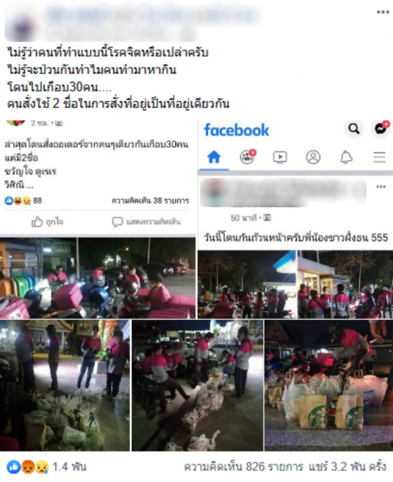 เรียกได้ว่าเป็นอีกหนึ่งเรื่องราว ที่ถูกวิพากษ์วิจารณ์อย่างมากในโลกออนไลน์ จากกรณีที่มีผู้ใช้เฟซบุ๊กท่านหนึ่ง ได้โพสต์ภาพเหล่าไรเดอร์ส่งอาหาร เกือบ 30 ราย ถูกลูกค้ารายเดียวกัน แต่ใช้ 2 ชื่อในการออเดอร์อาหาร โดยผู้ใช้เฟซบุ๊กรายหนึ่งระบุว่า ไม่รู้ว่าคนที่ทำแบบนี้....หรือเปล่าครับ ไม่รู้จะป่วนกันทำไมคนทำมาหากิน โดนไปเกือบ 30 คน คนสั่งใช้ 2 ชื่อในการสั่งที่อยู่เป็นที่อยู่เดียวกัน