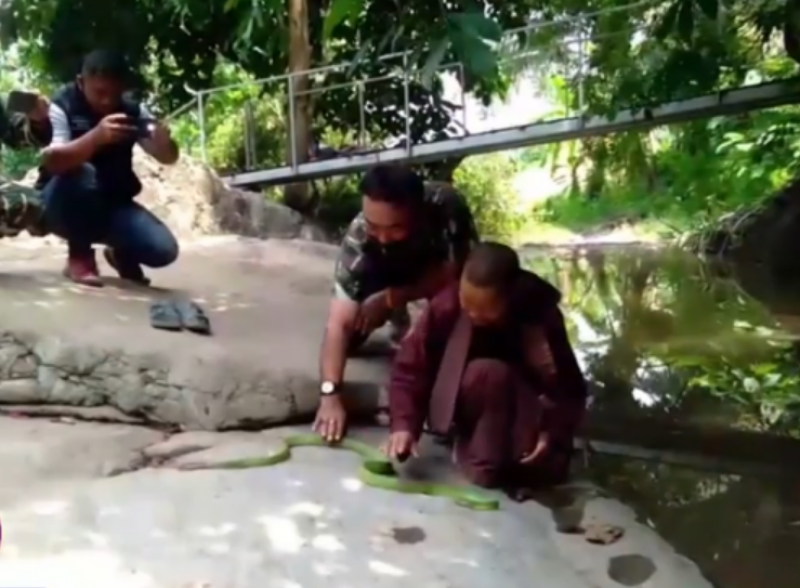 ล่าสุดวันนี้ นายเกิดพงธ์ โยหงส์ หัวหน้าเขตรักษาพันธุ์สัตว์ป่าภูผาแดง ต.ปากช่อง อ.หล่มสัก จ.เพชรบูรณ์ พร้อมเจ้าหน้าที่ เดินทางไปตรวจสอบ เนื่องจากคาดว่างูตัวดังกล่าวเป็นงูเขียวกาบหมาก ซึ่งเป็นสัตว์ป่าคุ้มครอง และเกรงว่าจะได้รับอันตราย เมื่อไปถึงพบชาวบ้านจำนวนหนึ่งกำลังนั่งดูงูตัวดังกล่าว ซึ่งยังคงนอนขดอยู่บนแท่นหินแท่นเดิม ต่อมาแม่ชีที่ปฏิบัติธรรมอยู่ที่สำนักปฏิบัติธรรม มาที่จุดดังกล่าว งูก็ได้เลื้อยออกมาอยู่ข้างๆ พร้อมทั้งให้เจ้าหน้าที่ได้ตรวจสอบและจับตัวได้อย่างใกล้ชิด