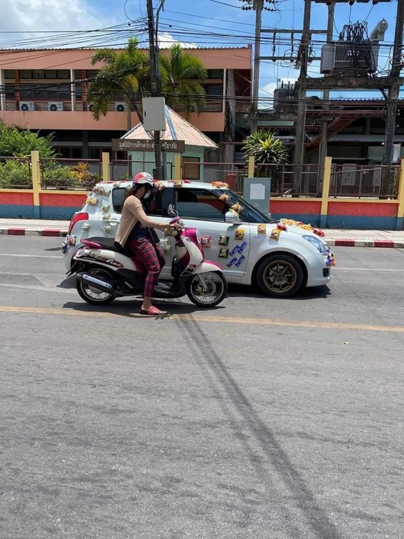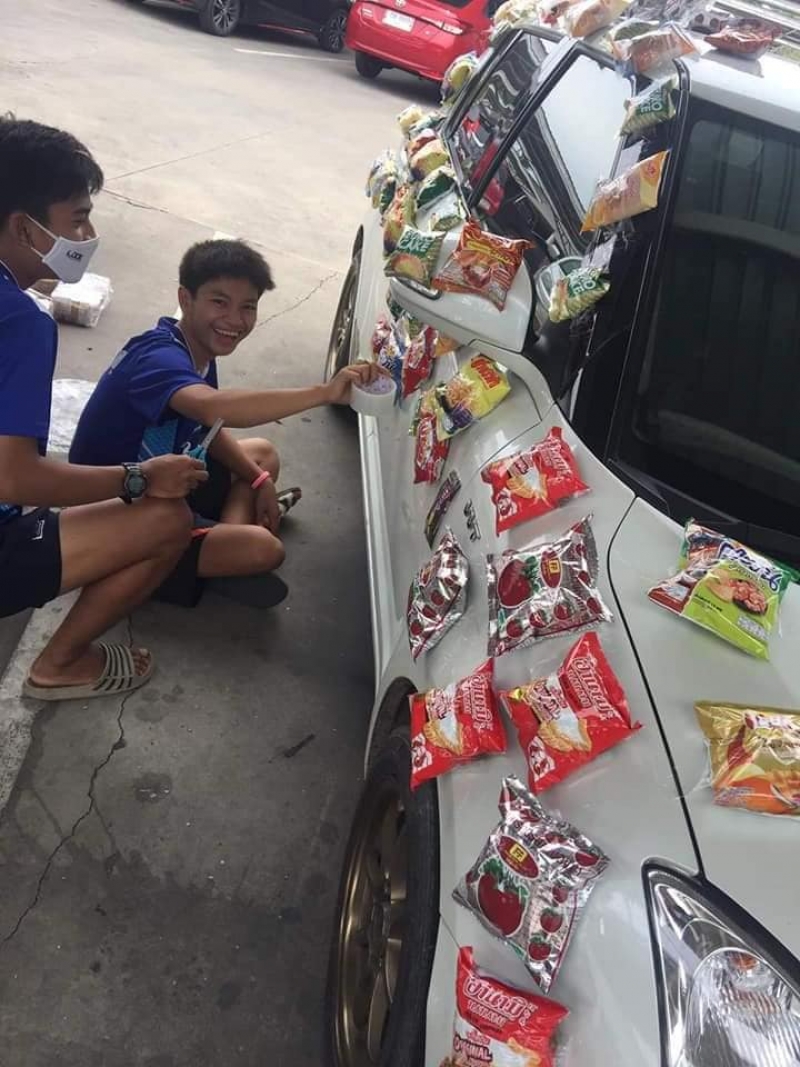 ฮือฮา รถปันสุข ติดขนมไว้รอบคัน