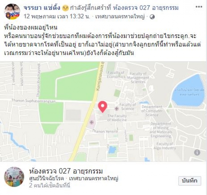 โดยก่อนหน้านี้ได้โพสต์ว่า พี่น้องของผมอยู่ไหน หรือคนนาบอนรู้จักช่วยบอกทีผมต้องการพี่น้องมาช่วยปลูกถ่ายไขกระดูก.จะได้หายขาดจากโรคที่เป็นอยู่ ยาก็เอาไม่อยู่ ลำบากจิงลูกยกทีนี้ทำพรือแล้วแต่เวณกรรมว่าจะให้อยู่นานเค่ไหนยังไงก็ต้องสู้กับมัน