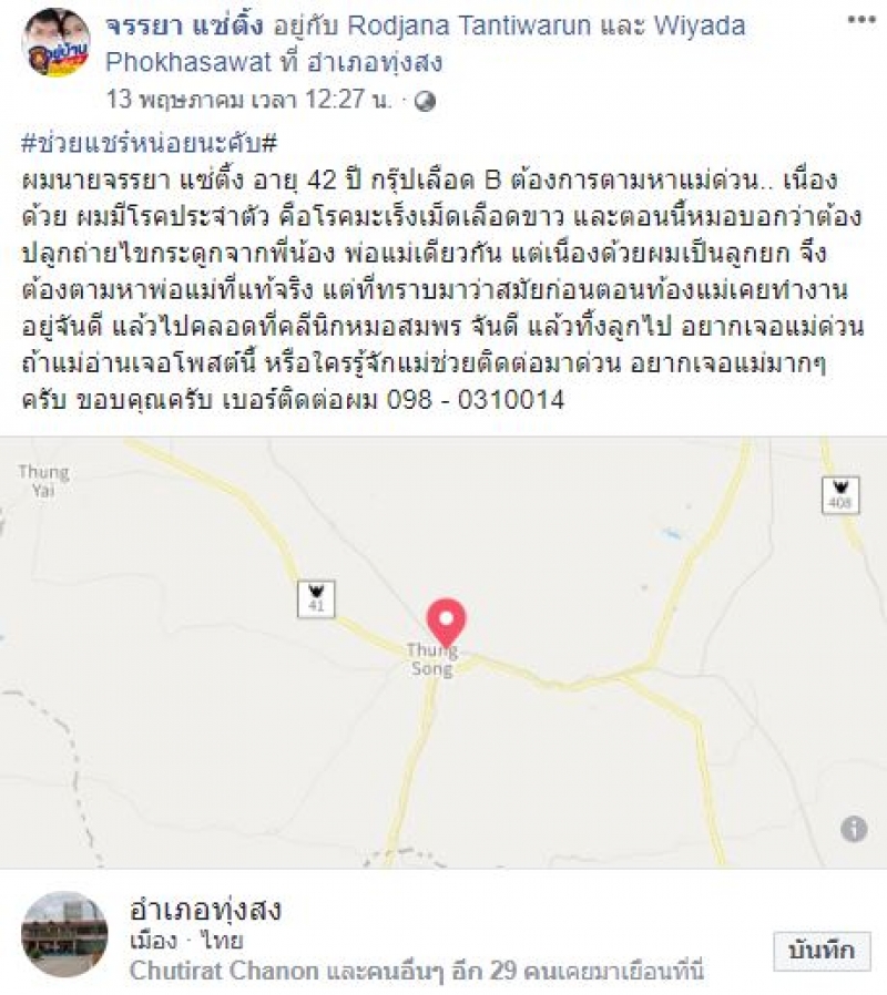 เรียกได้ว่าเป็นอีกหนึ่งเรื่องราวที่โซเชียลเข้ามาแสดงความเห็นกันเป็นจำนวนมาก หลังมีผู้ใช้เฟสบุ๊คชื่อ จรรยา แซ่ติ้ง ได้ออกมาโพสต์ตามหาแม่ พร้อมทั้งได้ระบุข้อความว่าผมนายจรรยา แซ่ติ้ง อายุ 42 ปี กรุ๊ปเลือด B ต้องการตามหาแม่ด่วน เนื่องด้วย ผมมีโรคประจำตัว คือโรคมะเร็งเม็ดเลือดขาว และตอนนี้หมอบอกว่าต้องปลูกถ่ายไขกระดูกจากพี่น้อง พ่อแม่เดียวกัน แต่เนื่องด้วยผมเป็นลูกยก จึงต้องตามหาพ่อแม่ที่แท้จริง
