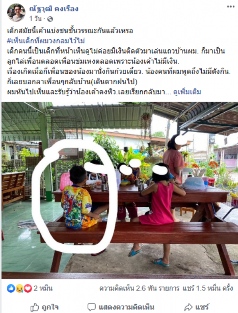 เรียกได้ว่าเป็นอีกหนึ่งเรื่องราวที่โซเชียลแสดงความเห็น และให้ความสนใจกันเป็นจำนวนมาก หลังมีผู้ใช้เฟสบุ๊คชื่อ ณัฐวุฒิ คงเรือง ได้โพสต์เรื่องราวระบุว่า เด็กสมัยนี้เค้าแบ่งชนชั้นวรรณะกันแล้วเหรอเห็นเด็กที่ผมวงกลมไว้ไม่ เด็กคนนี้เป็นเด็กที่หน้าเห็นดูไม่ค่อยมีเงินติดตัวมาเล่นแถวบ้านผม ก็มาเป็นลูกไล่เพื่อนตลอดเพื่อนข่มเหงตลอดเพราะน้องเค้าไม่มีเงิน