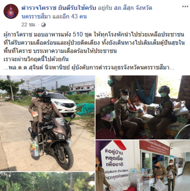 เรียกได้ว่าเป็นอีกหนึ่งเรื่องราว ที่ได้รับเสียงชื่นชมเป็นอย่างมาก เพจ ตำรวจโคราช ยินดีรับใช้ครับ ได้มีการลงภาพ เจ้าหน้าที่ตำรวจ นำของไปแจกชาวบ้านพร้อมกับระบุว่า ผู้การโคราช มอบอาหารแห้ง 510 ชุด ให้ทุกโรงพักนำไปช่วยเหลือประชาชนที่ได้รับความเดือดร้อนและผู้ป่วยติดเตียง ทั้งยังเดินทางไปเติมเต็มตู้ปันสุขในพื้นที่โคราช บรรเทาความเดือดร้อนให้ประชาชน เราจะผ่านวิกฤตนี้ไปด้วยกัน พล.ต.ต.สุจินต์ นิจพานิชย์ ผู้บังคับการตำรวจภูธรจังหวัดนครราชสีมา