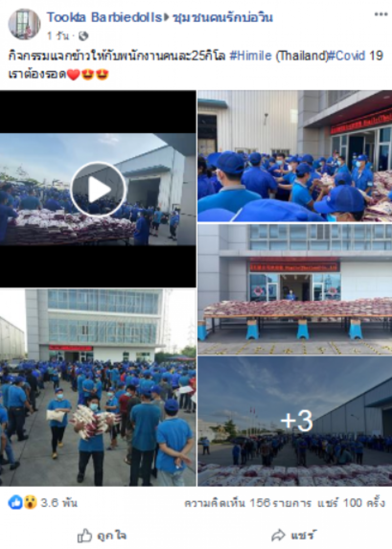 เรียกได้ว่าเป็นอีกหนึ่งเรื่องราวที่โซฌชียลเข้ามาแสดงความเห็น และคนให้ความสนใจกันเป็นจำนวนมาก หลังเฟซบุ๊กชื่อ tookta barbiedolls โพสต์ภาพขณะทีีคนงานกำลังเข้าคิวรับเข้าสารหน้าโรงงาน Himile thailand ซึ่งเป็นภาพที่ประทับในยามกฤติแบบนี้