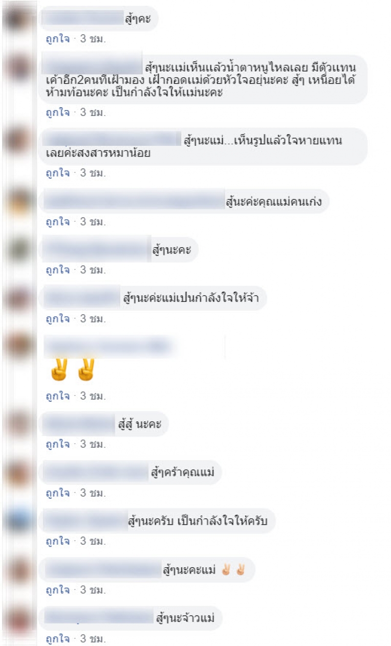 ทำให้โซเชียลที่ได้เห็นภาพดังกล่าวเข้ามาแสดงความคิดเห็นกันอย่างต่อเนื่อง โดยส่วนใหญ่เข้ามาให้กำลังใจคุณแม่คนเก่ง บ้างก็เข้ามาคอมเม้นต์ว่า สู้ๆ นะเเม่เห็นเเล้วน้ำตาหนูไหลเลย มีตัวเเทนเค้าอีก 2 คนที่เฝ้ามอง เฝ้ากอดเเม่ด้วยหัวใจอยู่นะคะ สู้ๆ เหนื่อยได้ห้ามท้อนะคะ เป็นกำลังใจให้เเม่นะคะ