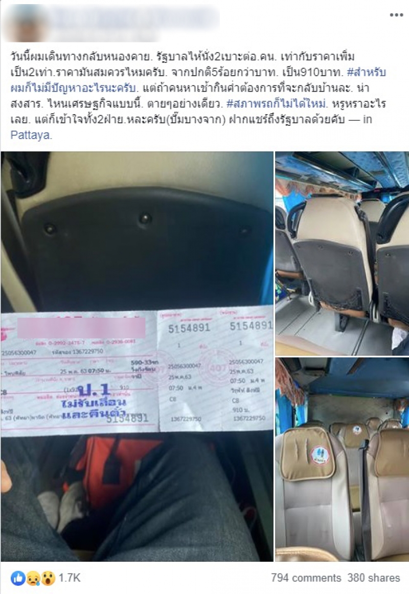 จากกรณีที่ ผู้ใช้เฟซบุ๊กรายหนึ่ง ได้ออกมาเผยเรื่องราว ที่ตนต้องนั่งรถโดยสารจากพัทย า เดินทางกลับบ้าน ที่จังหวัดหนองคาย แต่ปรากฎว่า ราคาค่ารถโดยสาร กลับพุ่งขึ้นเป็น 2 เท่า จากปกติ 500 กว่าบาท เป็น 910 บาท ผู้โพสต์จึงอยากให้หน่วยงานที่เกี่ยวข้องมาช่วยดูแล
