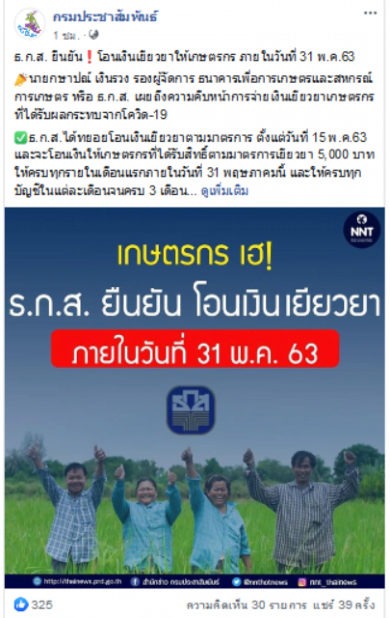 เฟชบุ๊กเพจของกรมประชาสัมพันธ์ เผยธนาคารเพื่อการเกษตรและสหกรณ์การเกษตร หรือ ธ.ก.ส. ยืนยัน โอนเงินให้เกษตรกร ภายในวันที่ 31 พ.ค.63 นายกษาปณ์ เงินรวง รองผู้จัดการ ธนาคารเพื่อการเกษตรและสหกรณ์การเกษตร หรือ ธ.ก.ส. เผยถึงความคืบหน้าการจ่ายเงินเกษตรกรที่ได้รับผลกระทบจาก covid-19