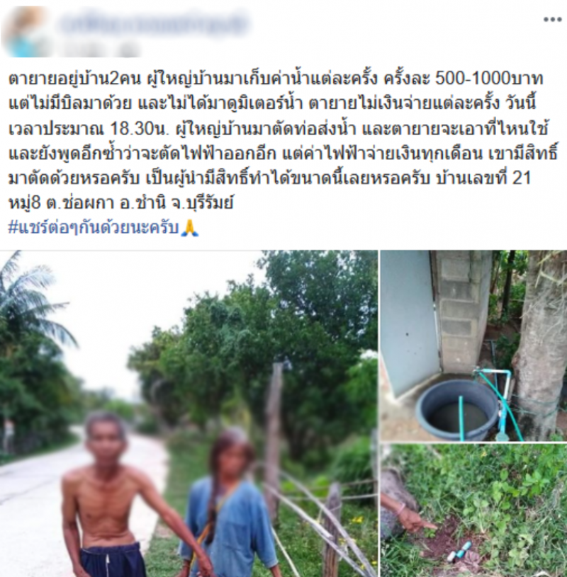 เรียกได้ว่าเป็นอีกหนึ่งเรื่องราว ที่ถูกวิพากษ์วิจารณ์เป็นอย่างมากในโลกออนไลน์ หลังจากที่มีผู้ใช้เฟซบุ๊กรายหนึ่ง ได้โพสต์เรื่องราวของคุณตากับคุณยายท่านหนึ่ง ที่ถูกตัดน้ำ โดยผู้โพสต์ระบุว่า ตากับยายอยู่บ้าน 2 คน ผู้ใหญ่บ้านมาเก็บค่าน้ำแต่ละครั้ง ครั้งละ 500-1000 บาท แต่ไม่มีบิลมาด้วย และไม่ได้มาดูมิเตอร์น้ำ ตากับยายไม่เงินจ่ายแต่ละครั้ง วันนี้เวลาประมาณ 18.30 น. ผู้ใหญ่บ้านมาตัดท่อส่งน้ำ และตากับยายจะเอาที่ไหนใช้ และยังพูดอีกซ้ำว่าจะตัดไฟฟ้าออกอีก แต่ค่าไฟฟ้าจ่ายเงินทุกเดือน เขามีสิทธิ์มาตัดด้วยหรอครับ เป็นผู้นำมีสิทธิ์ทำได้ขนาดนี้เลยหรอครับ บ้านเลขที่ 21 หมู่8 ต.ช่อผกา อ.ชำนิ จ.บุรีรัมย์
