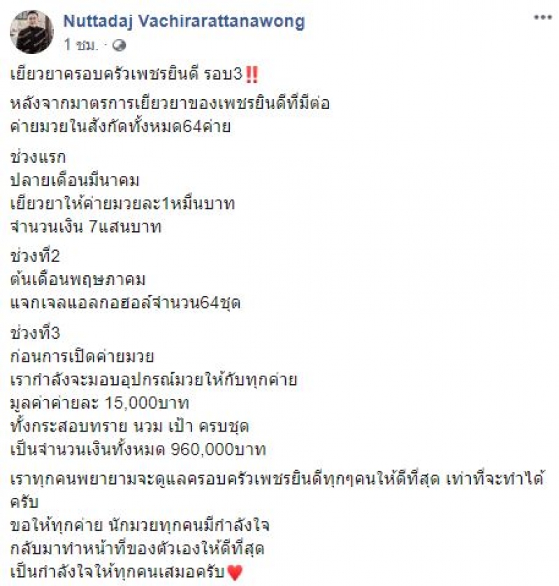 เมื่อวันที่ 28 พฤษภาคม 2563 บนเฟซบุ๊ก Nuttadaj Vachirarattanawong ของ เสี่ยโบ๊ท ณัฐเดช วชิรรัตนวงศ์ โปรโมเตอร์ใหญ่เพชรยินดี เผยยอดเงินเยียวยารอบที่ 3 ให้กับค่ายมวยกว่า 64 ค่าย เป็นกำลังใจให้พี่น้องนักมวยมีกำลังใจกลับมาทำหน้าที่ของตัวเองให้ดีที่สุด