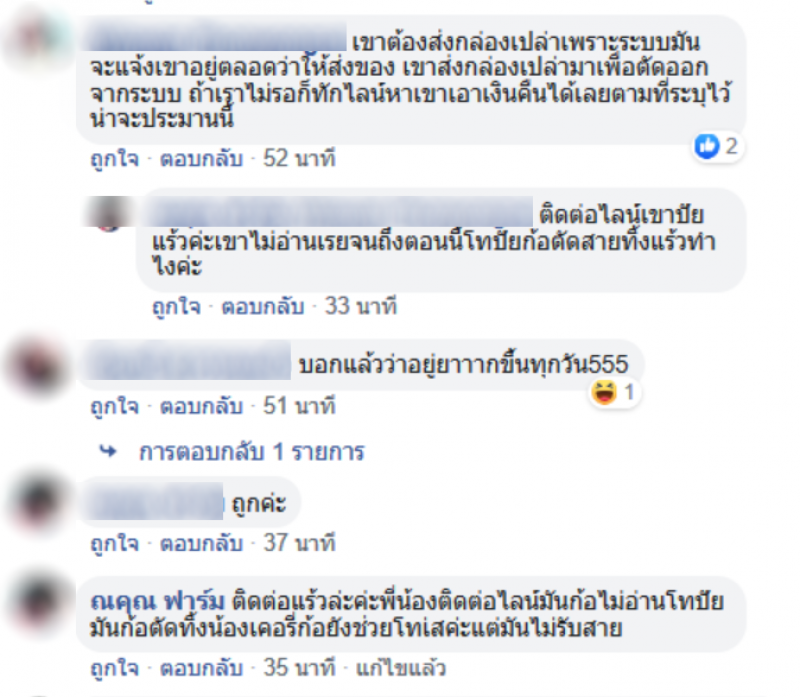 โดยหลังจากที่ได้โพสต์ออกไป ก็มีคนเข้ามาให้ข้อมูลเพิ่มเติมว่า เขาต้องส่งกล่องเปล่าเพราะระบบมันจะแจ้งเขาอยู่ตลอดว่าให้ส่งของ เขาส่งกล่องเปล่ามาเพื่อตัดออกจากระบบ ถ้าเราไม่รอก็ทักไลน์หาเขาเอาเงินคืนได้เลยตามที่ระบุไว้ น่าจะประมานนี้
