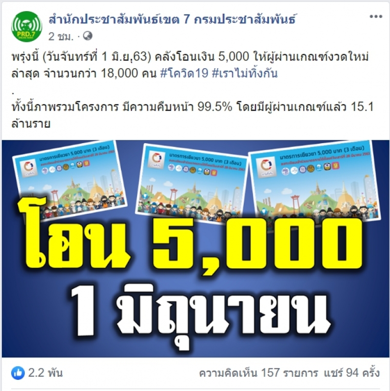 ล่าสุด ทางเพจสำนักประชาสัมพันธ์เขต 7 กรมประชาสัมพันธ์ ก็ได้ออกมาเผยว่า พรุ่งนี้ (วันจันทร์ที่ 1 มิ.ย.ุ63) คลังโอนเงิน 5,000 ให้ผู้ผ่านเกณฑ์งวดใหม่ล่าสุด จำนวนกว่า 18,000 คน เราไม่ทิ้งกัน ทั้งนี้ภาพรวมโครงการ มีความคืบหน้า 99.5% โดยมีผู้ผ่านเกณฑ์แล้ว 15.1 ล้านราย