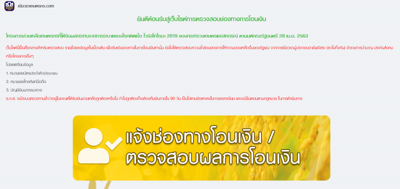 ทั้งนี้ เกษตรกร สามารถตรวจสอบสิทธิ์ การรับเงินช่วยเหลือเกษตรกร ได้ผ่านทางเว็บไซต์ www.เยียวย าเกษตรกร.com โดยมีวิธีการดังนี้