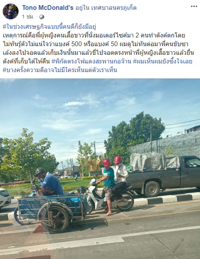 ในช่วงเศรษฐกิจแบบนี้คนดีก็ยังมีอยู่ เหตุการณ์คือพี่ผู้หญิงคนเสื้อขาวที่นั่งมอเตอร์ไซค์มา 2 คนทำตังค์ตกโดยไม่ทันรู้ตัวไม่แน่ใจว่าแบงค์ 500 หรือแบงค์ 50 ผมดูไม่ทันต่อมาพี่คนขับซาเล้งลงไปจอดแล้วเก็บเงินนั้น