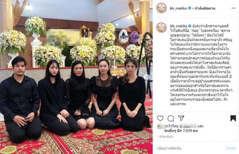 ล่าสุด นักเเสดงชื่อดังอีกหนึ่งคนที่เคยร่วมงานกับ ตั้ว ศรัณยู อย่าง บี มาติกา นั้นก็สุดเศร้า เดินทางมากราบลา ตั้ว ศรัณยู เป็นครั้งสุดท้าย ในงานสวดพระอภิธรรมคืนแรก