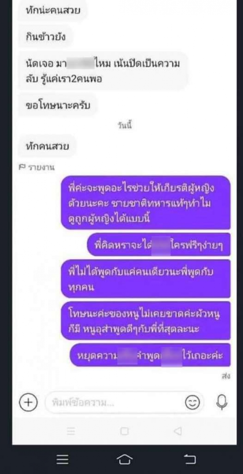 จากกรณีในโลกออนไลน์มีการนำแชทระหว่างเจ้าหน้าที่ซึ่งถูกระบุว่าเป็นทหาร และแชทหาหญิงสาวมาเปิดเผยด้วย ทำให้เกิดกระแสวิพากษ์วิจารณ์อย่างร้อนแรงในพื้นที่ข้อความพูดคุยผ่านแอปฯที่ถูกนำมาเปิดเผย เป็นข้อความของฝ่ายชายเข้ามาทักทายฝ่ายหญิง ตอนแรกก็ชื่นชมความน่ารักของฝ่ายหญิง แต่หลังจากนั้นมีการส่งข้อความขอมีเพศสัมพันธ์ ทำให้ฝ่ายหญิงตอบปฏิเสธ และด่ากลับ