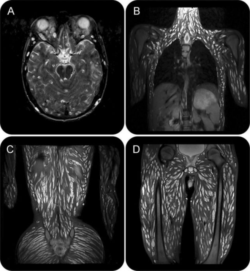 แพทย์ตรวจ MRI พบซีสต์จำนวนมากในเนื้อเยื่อสมอง ศีรษะ กล้ามเนื้อ คอ ผนังหน้าอก ผนังหน้าท้อง กล้ามเนื้อข้างกระดูกสันหลัง สะโพก กระดูกเชิงกราน และกล้ามเนื้อแขนขา