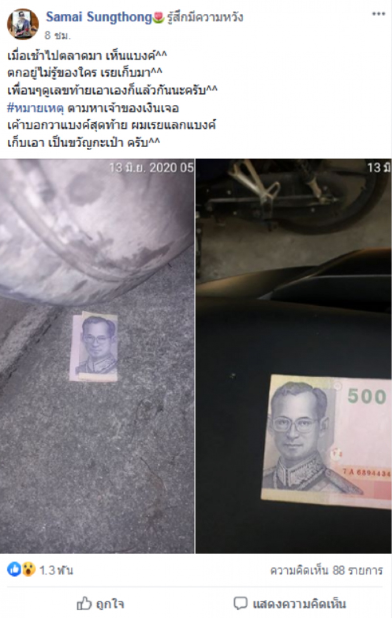หนุ่มโพสต์เจอเงินแบงค์ 500 เพื่อนๆแห่ซื้อเลขท้าย
