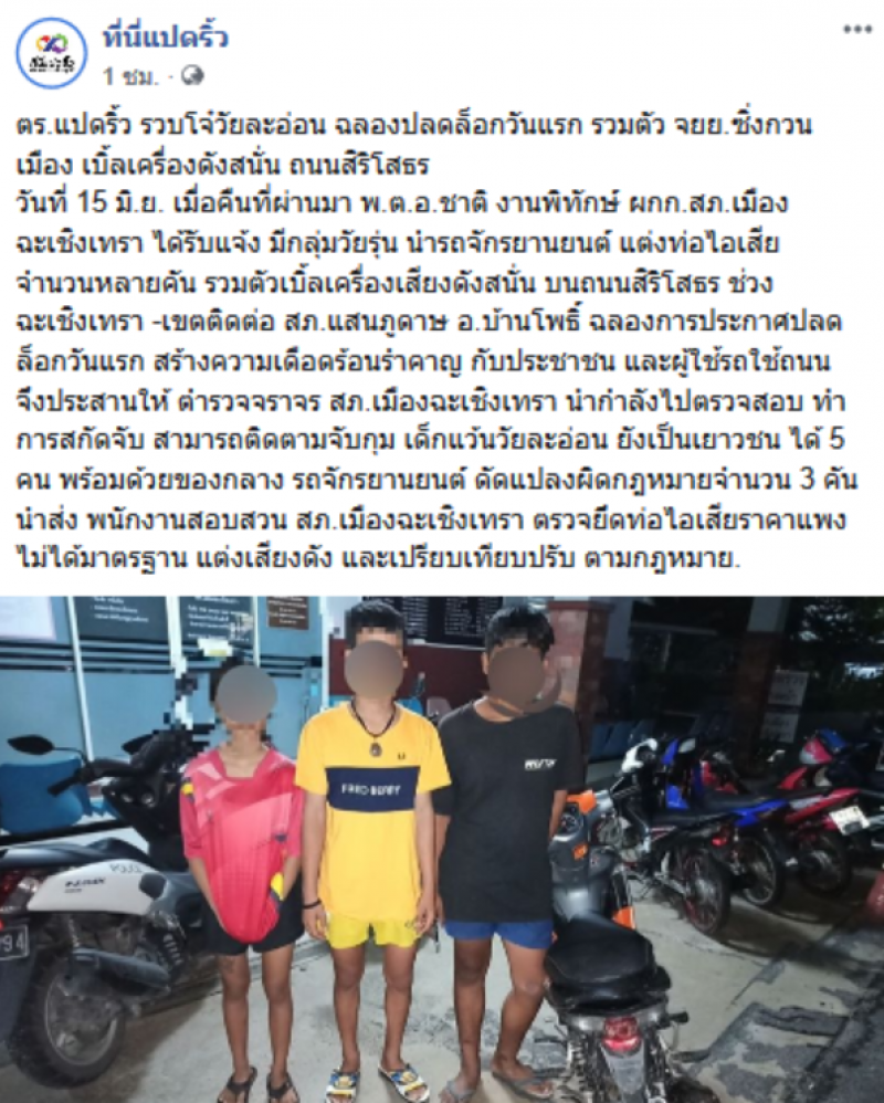 สร้างความเดือดร้อนรำคาญ กับประชาชน และผู้ใช้รถใช้ถนน จึงประสานให้ ตำรวจจราจร สภ.เมืองฉะเชิงเทรา นำกำลังไปตรวจสอบ ทำการสกัดจับ สามารถติดตามจับกุม เด็กแว้นวัยละอ่อน ยังเป็นเยาวชน ได้ 5 คน พร้อมด้วยของกลาง รถจักรยานยนต์ ดัดแปลงผิดกฎหมายจำนวน 3 คัน นำส่ง พนักงานสอบสวน สภ.เมืองฉะเชิงเทรา ตรวจยึดท่อไอเสียราคาแพง ไม่ได้มาตรฐาน แต่งเสียงดัง และเปรียบเทียบปรับ ตามกฎหมาย