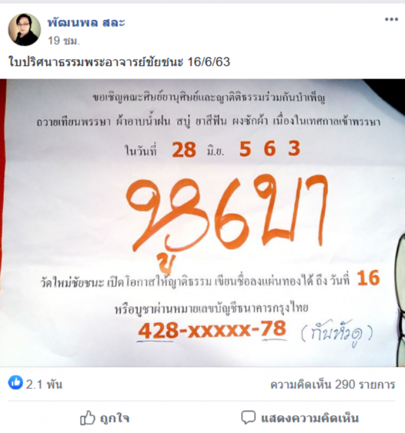ใกล้เข้ามาแล้วจ้า สำหรับวันที่หลายๆคนรอคอย สำหรับการประกาศผลรางวัล สลากกินแบ่งรัฐบาลระจำวันที่ 16 มิถุนาคม 63 เชื่อว่าหลายๆคนคงมีเลขในใจอยู่แล้ว และหลายๆคนคงกำลังมองหาเลขกันอยู่ วันนี้เราจึงได้รวบรวมข้อมูลมาฝากกัน หลังมีผู้ใช้เฟสบุ๊คชื่อ พัฒนพล สละ ได้ออกมาโพสต์ เลขอาจารญ์ ชัยชนะ พร้อมทั้งได้ระบุข้อความว่า