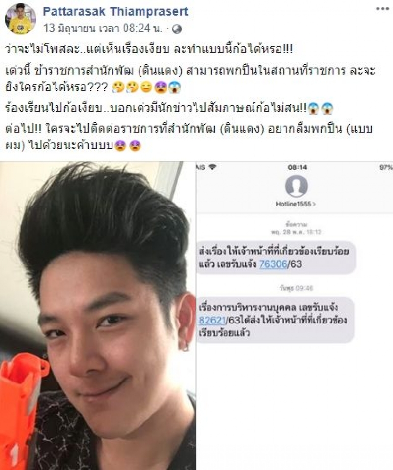 โดย เก่ง เกียร์อาร์ โพสต์ข้อความระบุว่า ว่าจะไม่โพสต์ละ แต่เห็นเรื่องเงียบ ละทำแบบนี้ก็ได้หรอ เดี๋ยวนี้ ข้าราชการ หน่วยงานแห่งหนึ่งย่านดินแดง สามารถพกปืนในสถานที่ราชการ และจะยิงใครก็ได้เหรอ ร้องเรียนไปก็เงียบ บอกเดี๋ยวมีนักข่าวไปสัมภาษณ์ก็ไม่สน ต่อไป ใครจะไปติดต่อราชการ อยากลืมพกปืน (แบบผม) ไปด้วยนะค้าบบ