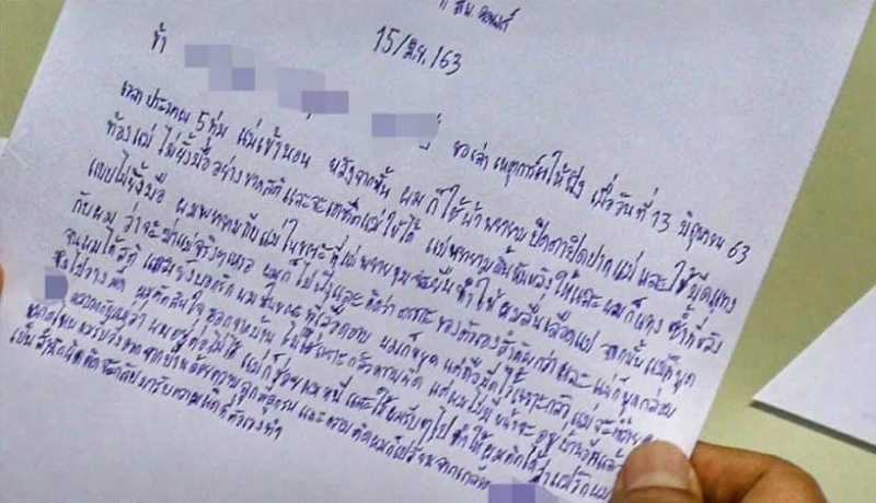 นอกจากนี้ เด็กชาย อายุ 16 ปี ยังได้เขียนบันทึกขึ้นมาฉบับหนึ่งด้วยลายมือเพื่อเล่าเหตุการณ์ในคืนเกิดเหตุให้ฟังว่า เมื่อวันที่ 13 มิถุนายน 2563 เวลาประมาณ 5 ทุ่ม แม่เข้านอน จากนั้นผมก็ใช้ผ้าพยายามปิดตาปิดปากแม่