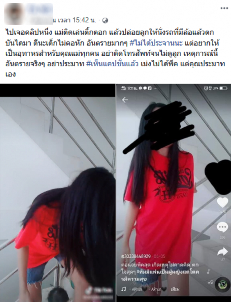 โดยผู้โพสต์ระบุว่า ไปเจอคลิปหนึ่ง แม่ติดเล่นติ้กตอก แล้วปล่อยลูกให้นั่งรถที่มีล้อแล้วตกบันไดมา ดีนะเด็กไม่คอหัก อันตรายมากๆ ไม่ได้ประจานนะ แต่อยากให้เป็นอุทาหรสำหรับคุณแม่ทุกคน อย่าติดโทรสัพท์จนไม่ดูลูก เหตุการณ์นี้อันตรายจริงๆ อย่าประมาท เห็นแคปชั่นแล้ว เม่งไม่ได้พีค แต่คุณประมาทเอง