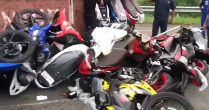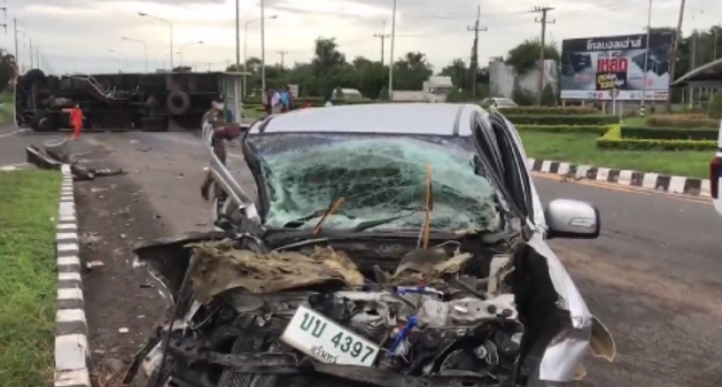 กระบะพุ่งประสานงา รถบรรทุกคว่ำเทกระจาด จยย.ใหม่เอี่ยม ล้มระเนระนาด